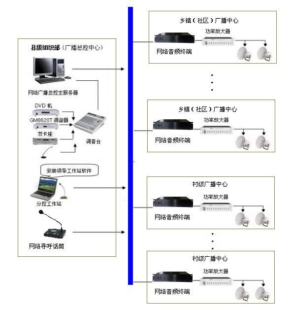 2、建立各鄉(xiāng)鎮(zhèn)級控制平臺(tái)或者村級網(wǎng)絡(luò)音頻終端接收點(diǎn)