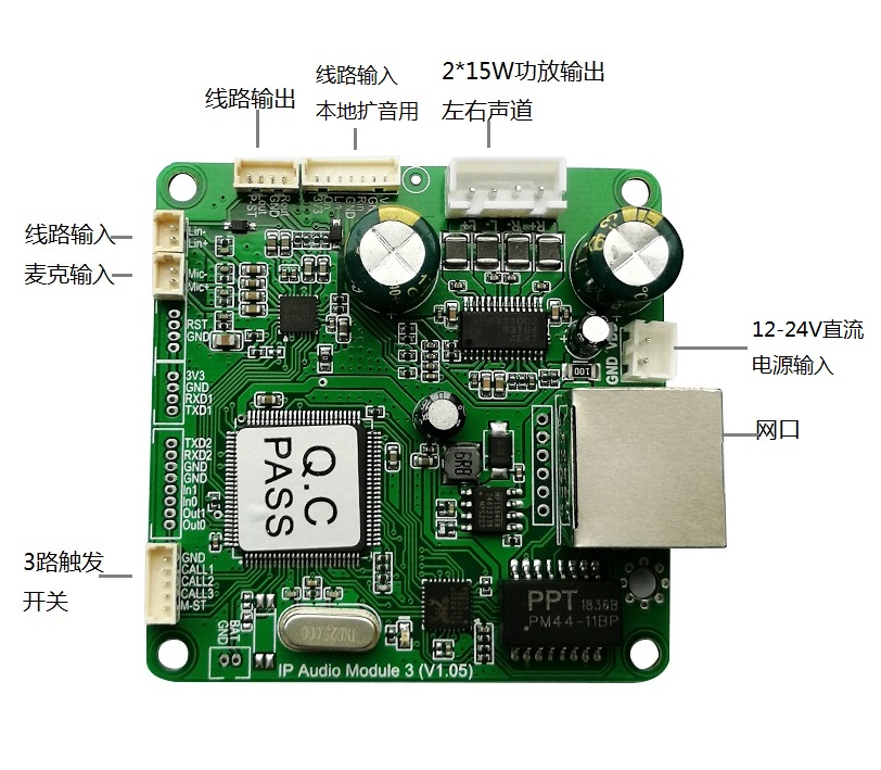 播放 | 對講 | 錄播 | 對講錄播控制接口 | Line Out | Line In Mic | 控制串口 | GPIO 通用串口 | 2×15W 功放 | |